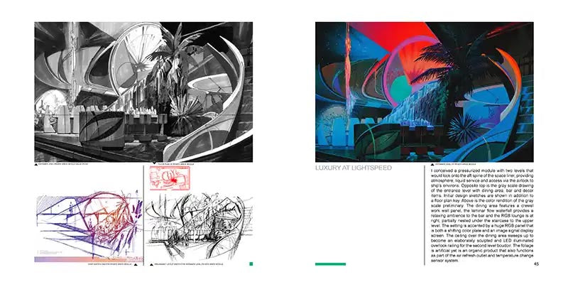Sentury II, published in 2010, offers a rare view into nearly a decade of Syd's imagination. The work moved between robotics for Japanese animation, restaurant interiors with architect Philip Koether, the Honda Monster Bike, yacht concepts, automotive proposals for Ford, subterranean drilling vessels, cityscapes and personal explorations he rarely showed publicly. The 176 pages document both commercial commissions and speculative projects: intricate mechanical props alongside what Syd called his "elaborate figures," production designs for studio films next to lifestyle scenarios that exist somewhere between architectural proposal and pure vision. Looking through the work, you find yourself waiting for his future to arrive in our present. Vehicles that should exist, interiors we should inhabit, a version of tomorrow that feels more compelling than ever.